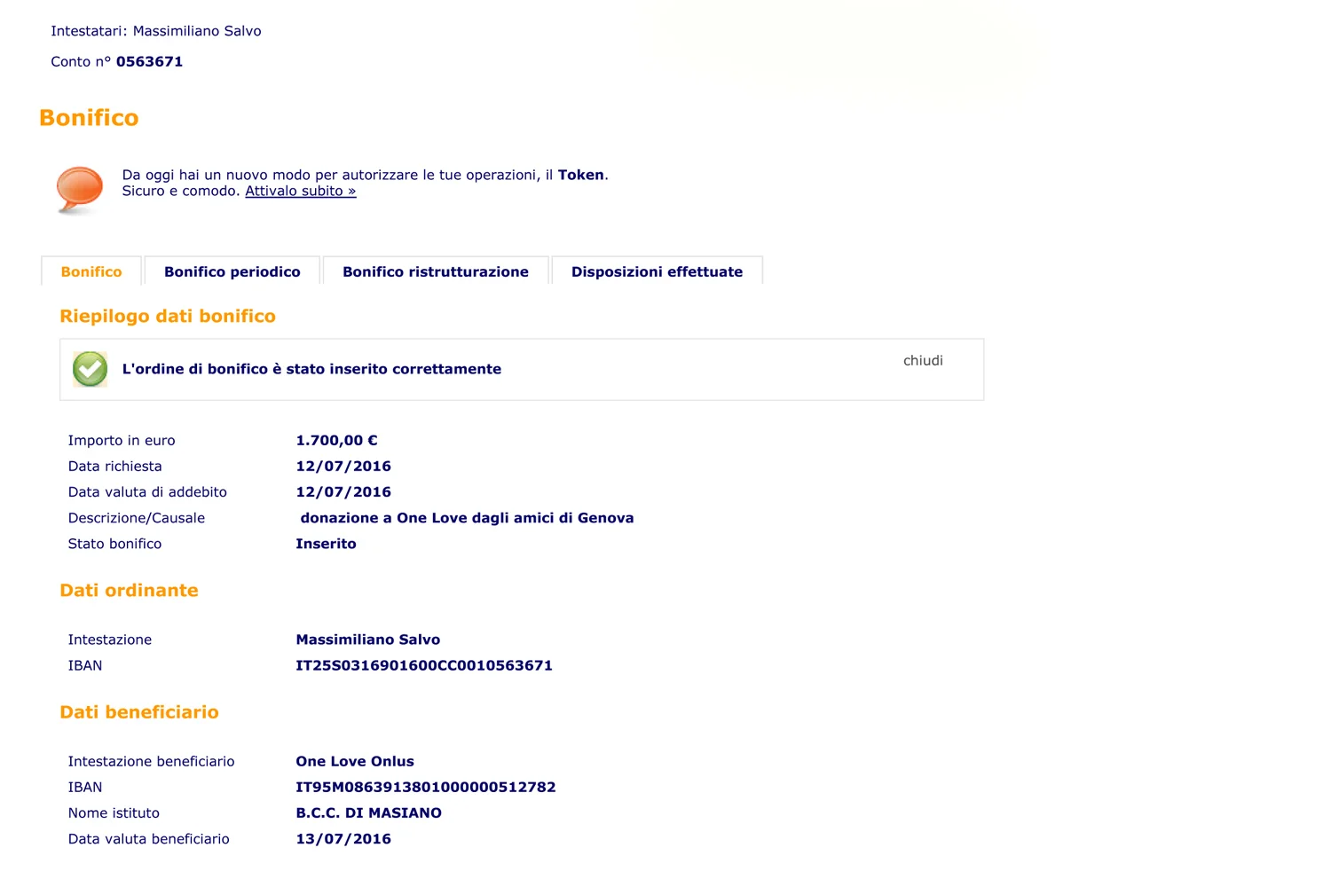La cifra che avanzerà sarà consegnata comunque a One Love Onlus con un nuovo bonifico, visto che tanto devo ancora ricevere qualche donazione.
