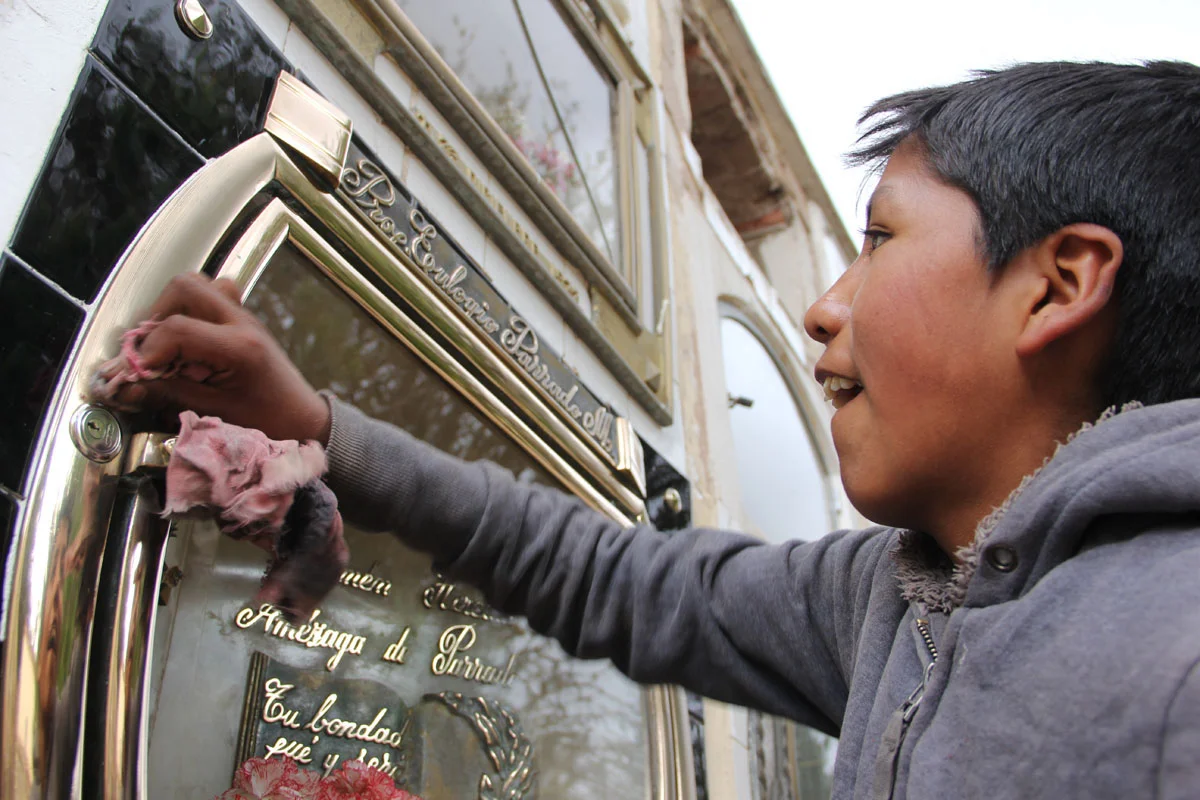 Lavorare al cimitero di Potosì è tra i mestieri più ambiti. C’è chi trasporta i secchi d’acqua per innaffiare i fiori e chi pulisce le lapidi. I piccoli lavoratori hanno stabilito un tariffario in base alla sporcizia del marmo. «Così non ci facciamo fregare» – sorride orgoglioso Armando, 13 anni – I grandi provano sempre a pagarci meno del dovuto».